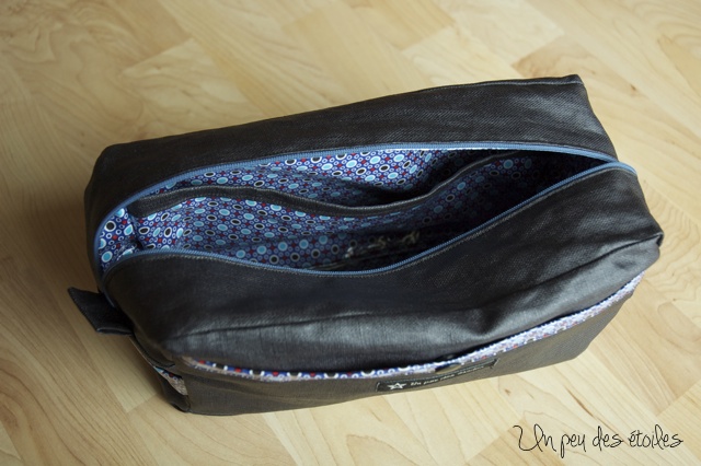 J’ai commencé par la trousse pour homme. J’ai choisi un tissu enduit Petit pan et un lin enduit noir assorti. Ensuite… j’ai improvisé.